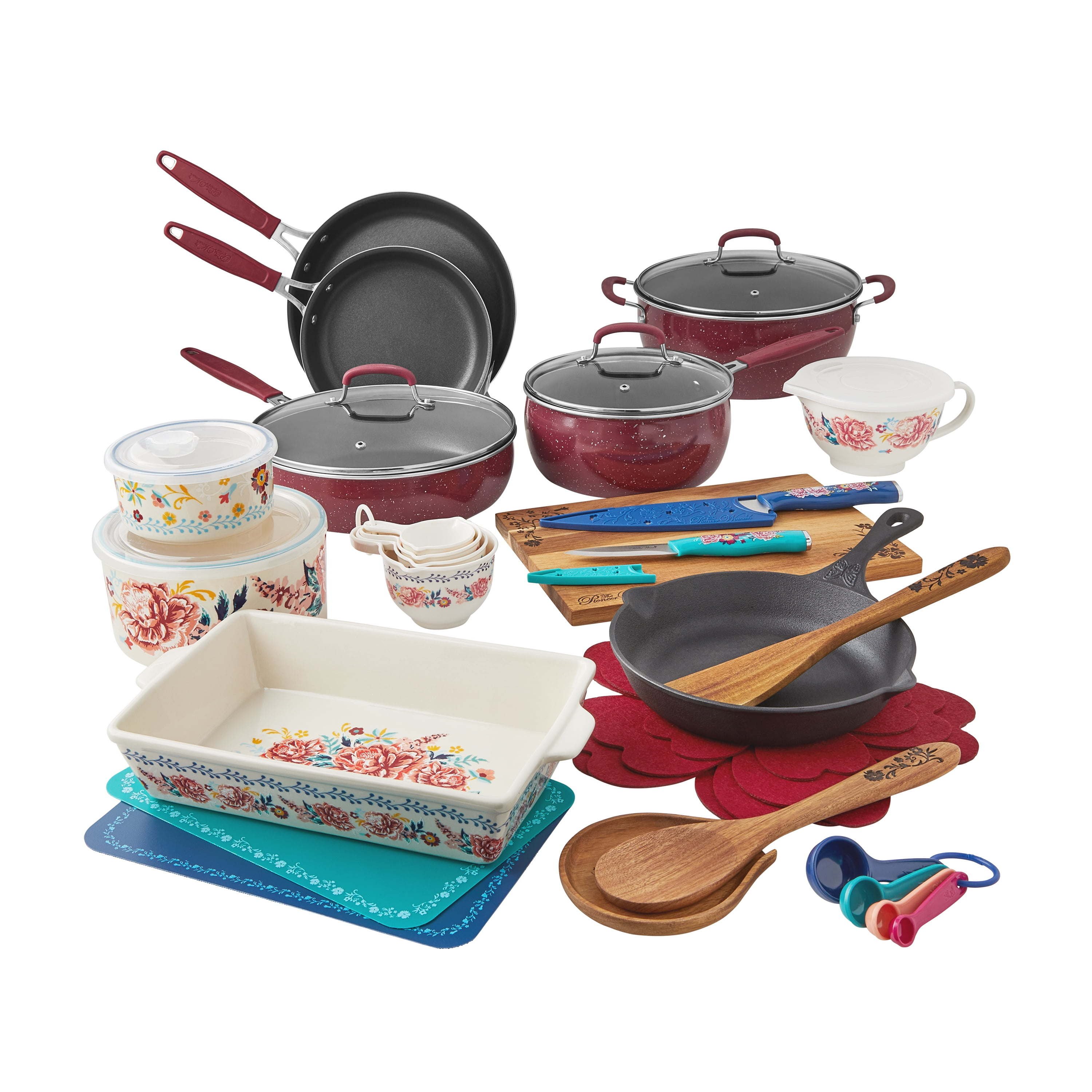 Brilliant Blooms 38-Piece Cookware Set has everything you need for a complete kitchen. With 38 pieces, you have all the pieces you need to cook a mouthwatering meal that your friends and family will love. From pots and pans to utensils and storage containers, this cookware set is made with durable materials and features one of Ree's signature floral designs for a colorful addition to your kitchen. Use it to make Ree's famous chicken spaghetti for a hearty meal or serve up her sweet blueberry crumble as a delicious dessert. Make your favorite meals with Brilliant Blooms 38-Piece Cookware Set.Meet Ree:Ree Drummond is a NY Times Best Selling Author, TV personality, social media phenom, and the woman behind the popular Pioneer Woman lifestyle blog that started it all. She's also a lover of butter, basset hounds, Ethel Merman, her hunky, cowboy husband Ladd, and their four kids. Her casual country style and delicious recipes have made her a go-to for all things cooking and entertaining.